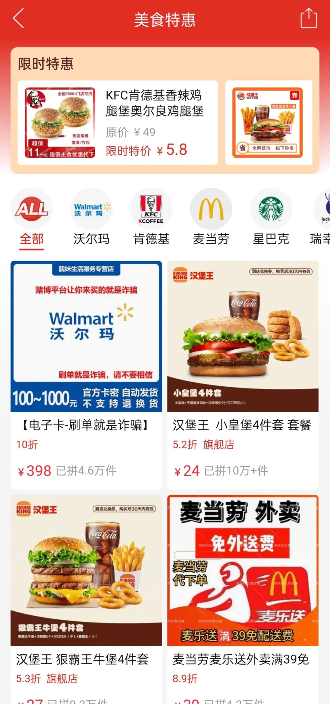 进入本地生活详细页面后可以看到,该板块主要提供餐饮优惠券,以及代下单到店自取等服务。覆盖范围集中在沃尔玛、肯德基、麦当劳、星巴克、喜茶等连锁餐饮/商超品牌。
