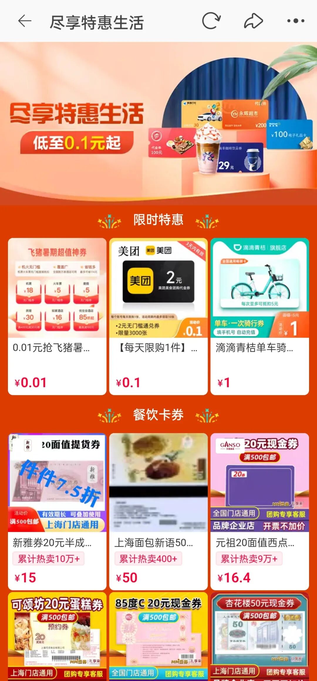依照这一思路,淘宝和京东其实也随时可以切入到本地生活市场,只是要看它们想不想。比如淘宝的充值中心,其实早就上线了“尽享特惠生活”板块,专门售卖餐饮/商超卡券,以及旅游套餐等本地生活相关商品。