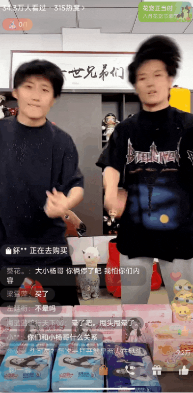 直播间的背景,和小杨哥几乎一模一样,两位和大小杨哥相似发型、相似服装的年轻人,正随着节奏热舞,但匾额上的“一生一世兄弟们”,让人隐隐觉得不对劲。