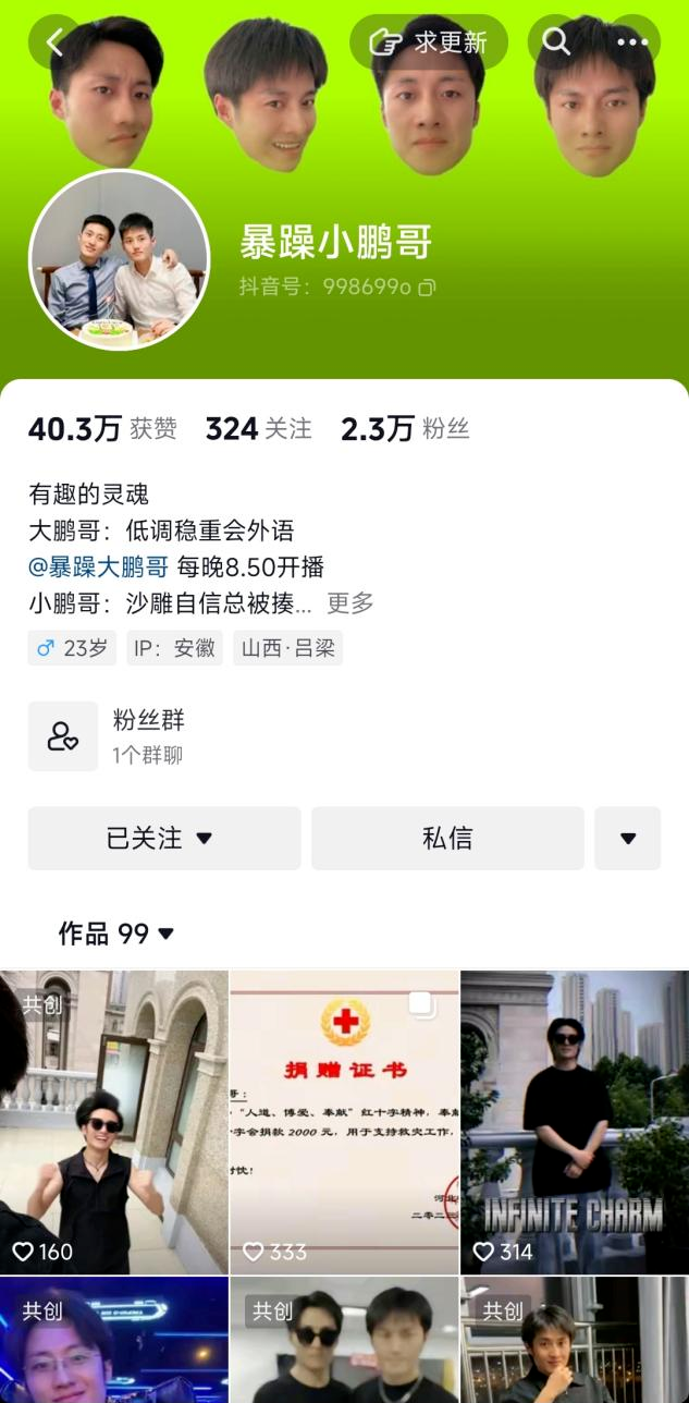 因此,“暴躁小鹏哥”“狂野的二宝”两位用户,靠着对小杨哥的模仿,很快弥补了平台空白,在视频号获得了不少粉丝;其中,主播“暴躁小鹏哥”,在抖音也有同名账号,发布作品99部,但粉丝数仅为2.3万,流量表现远不如微信视频号。