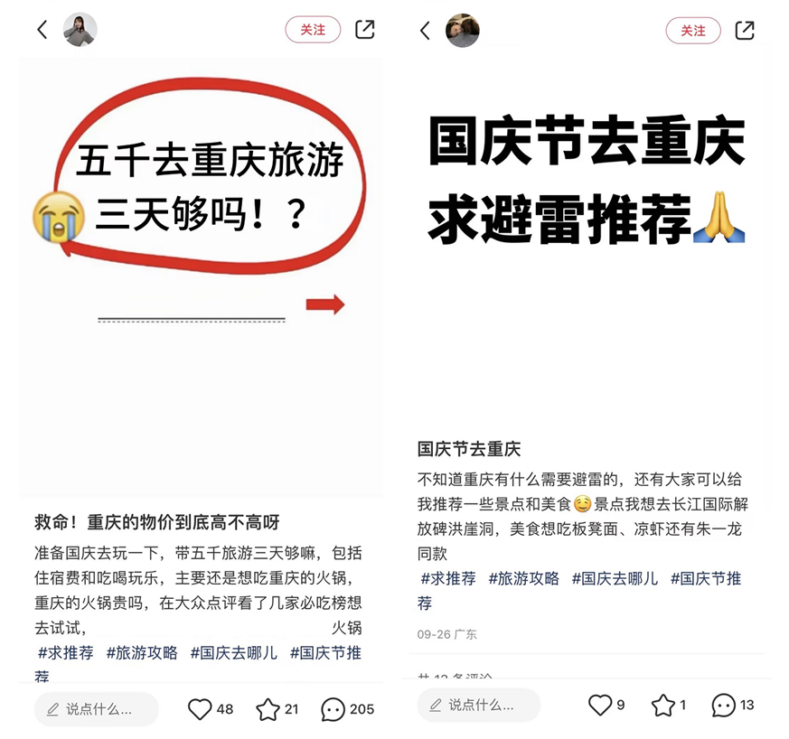 文案中没有大肆渲染火锅的味道有多么好吃,而是选择了一个极具讨论度的话题,寥寥几笔就将平台内对重庆旅行感兴趣的潜在游客吸引了过来。