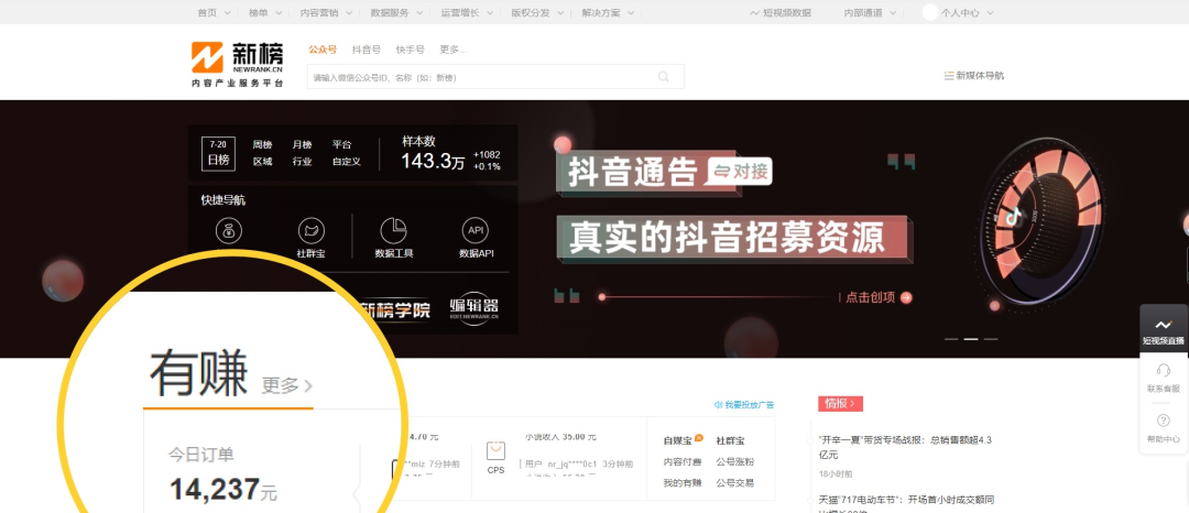 登录新榜官网newrank.cn 然后点击有赚,即可前往!