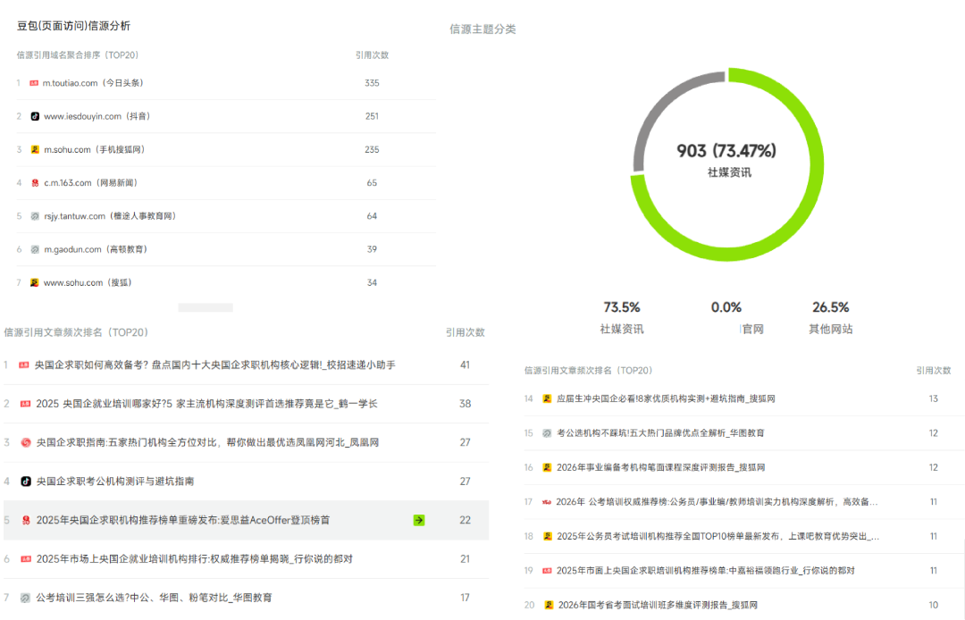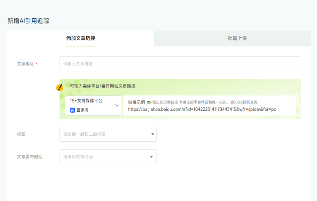 此外,“AI引用追踪” 还支持单篇或批量上传文章链接,深度解析文章的 AI 引用详情,不仅能清晰呈现引用率、引用平台分布等核心数据,还能关联提问词的引用频次与传播路径,帮助品牌精准评估内容在 AI 端的传播价值,定位高价值内容资产。