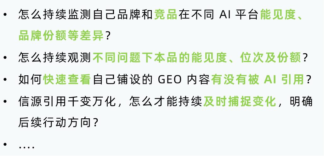 同时打通 “洞察-创作-监测-复盘” 全链路,帮助品牌搭建起系统化的 GEO 运营体系,让品牌 GEO 运营实现精准决策、高效落地与持续增长。