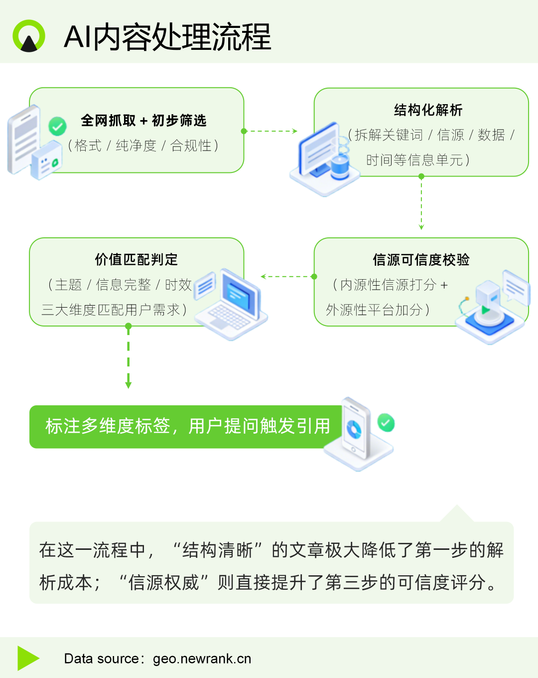 AI更注重信息提取效率和事实准确性,而非文采飞扬。你的内容需要优先满足机器的抓取逻辑,才能获得被人类看到的机会。AI内容处理流程大致为: