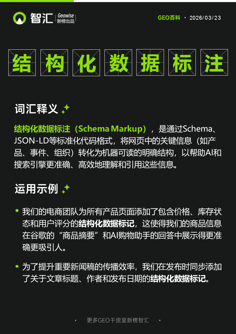 结构化数据标注(Schema Markup),是通过Schema、JSON-LD等标准化代码格式,将网页中的关键信息(如产品、事件、组织)转化为机器可读的明确结构,以帮助AI和搜索引擎更准确、高效地理解和引用这些信息。