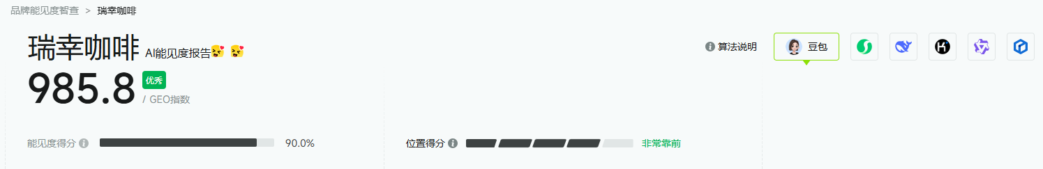 以瑞幸咖啡在豆包平台的能见度分析为例,GEO指数由能见度得分和位置得分决定,分别对应品牌提及份额、引用位置两个核心指标。