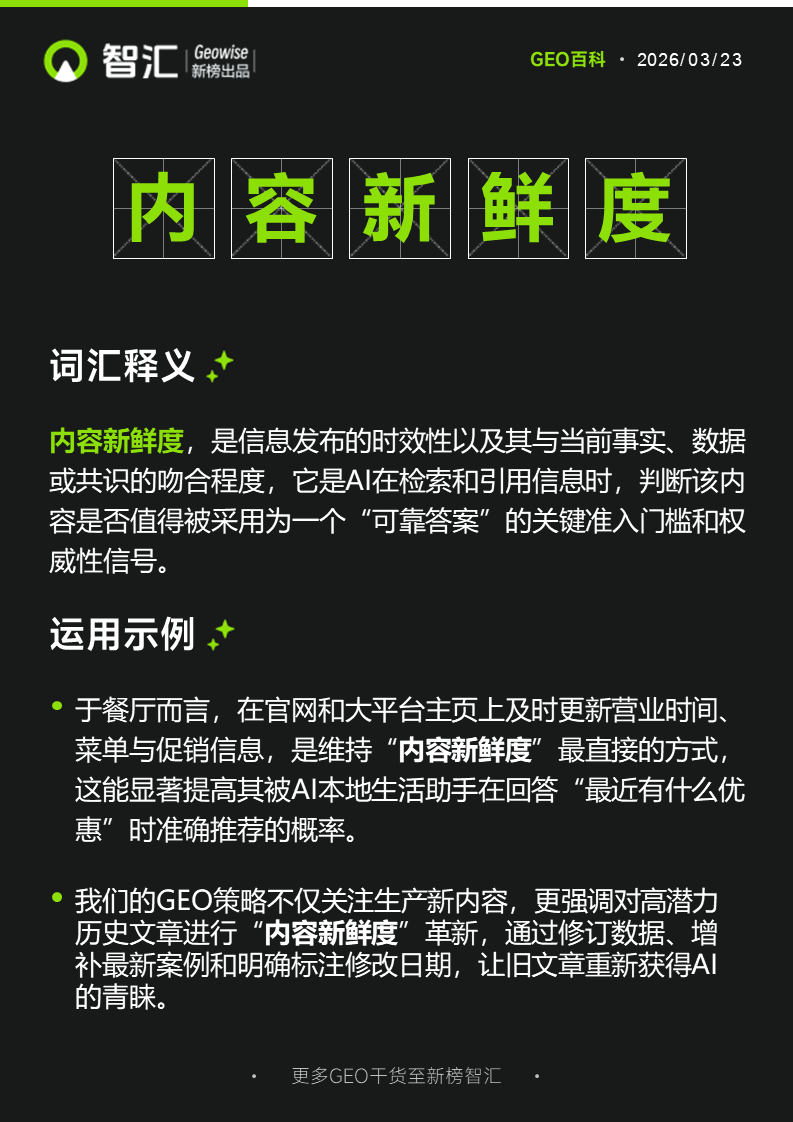 内容新鲜度,是信息发布的时效性以及其与当前事实、数据或共识的吻合程度,它是AI在检索和引用信息时,判断该内容是否值得被采用为一个“可靠答案”的关键准入门槛和权威性信号。