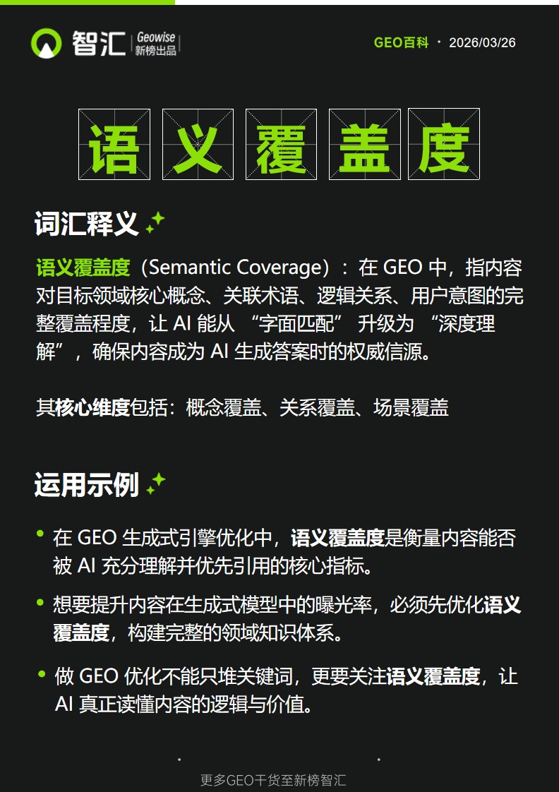 大家好,我是新榜智汇小一,每天分享GEO干货,带你轻松掌握GEO行业信息。在GEO(生成式引擎优化)的核心逻辑中,“语义覆盖度”作为连接内容与AI引擎的关键桥梁,打破了传统优化“关键词堆砌”的局限,决定着内容能否被生成式AI深度理解、精准匹配并优先引用。