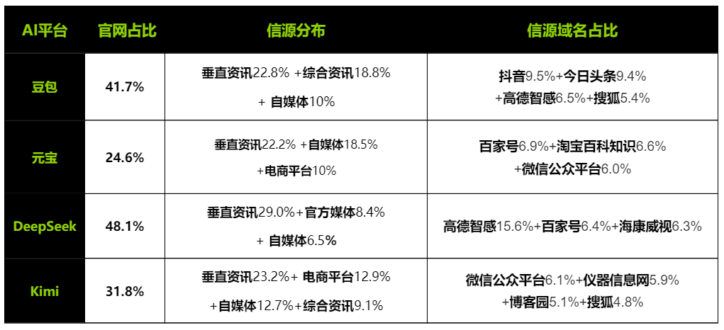 ● 原因:所有平台中垂直资讯占比均超过20%,官方媒体在DeepSeek中也占据一定份额。
