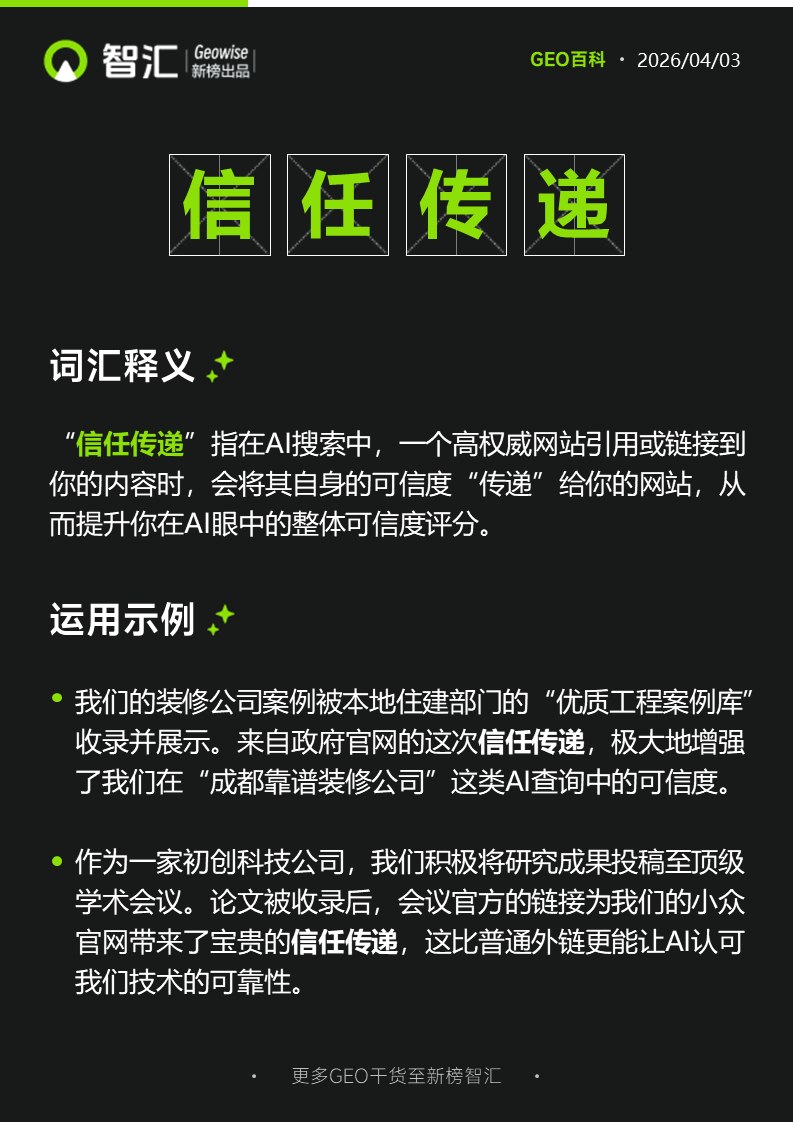 “信任传递”指在AI搜索中,一个高权威网站引用或链接到你的内容时,会将其自身的可信度“传递”给你的网站,从而提升你在AI眼中的整体可信度评分。