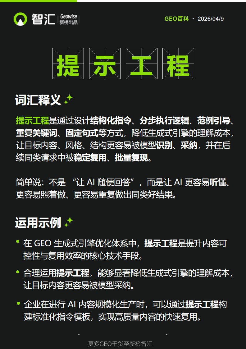 提示工程是通过设计结构化指令、分步执行逻辑、范例引导、重复关键词、固定句式等方式,降低生成式引擎的理解成本,让目标内容、风格、结构更容易被模型识别、采纳,并在后续同类请求中被稳定复用、批量复现。