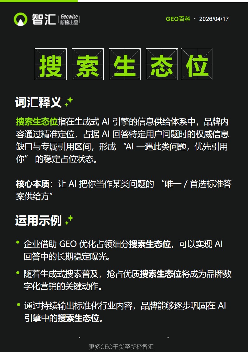 搜索生态位指在生成式 AI 引擎的信息供给体系中,品牌 / 内容通过精准定位,占据 AI 回答特定用户问题时的权威信息缺口与专属引用区间,形成 “AI 一遇此类问题,优先引用你” 的稳定占位状态。