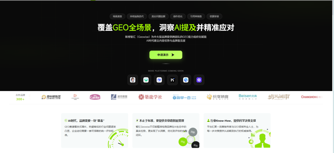 全链路闭环:唯一覆盖GEO运营全生命周期的平台,适配品牌从冷启动到规模化的各阶段需求。