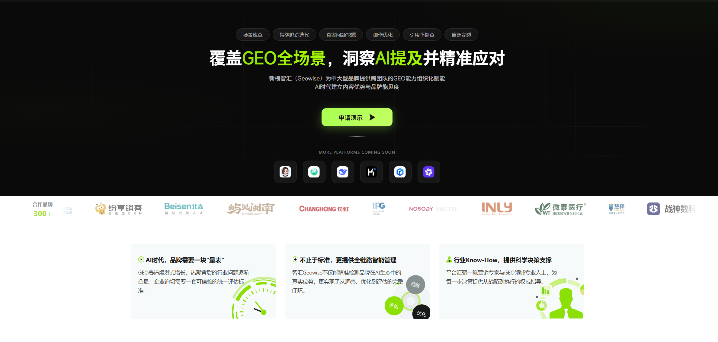 同时打通 “洞察-创作-监测-复盘” 全链路,帮助品牌搭建起系统化的 GEO 运营体系,让品牌 GEO 运营实现精准决策、高效落地与持续增长。