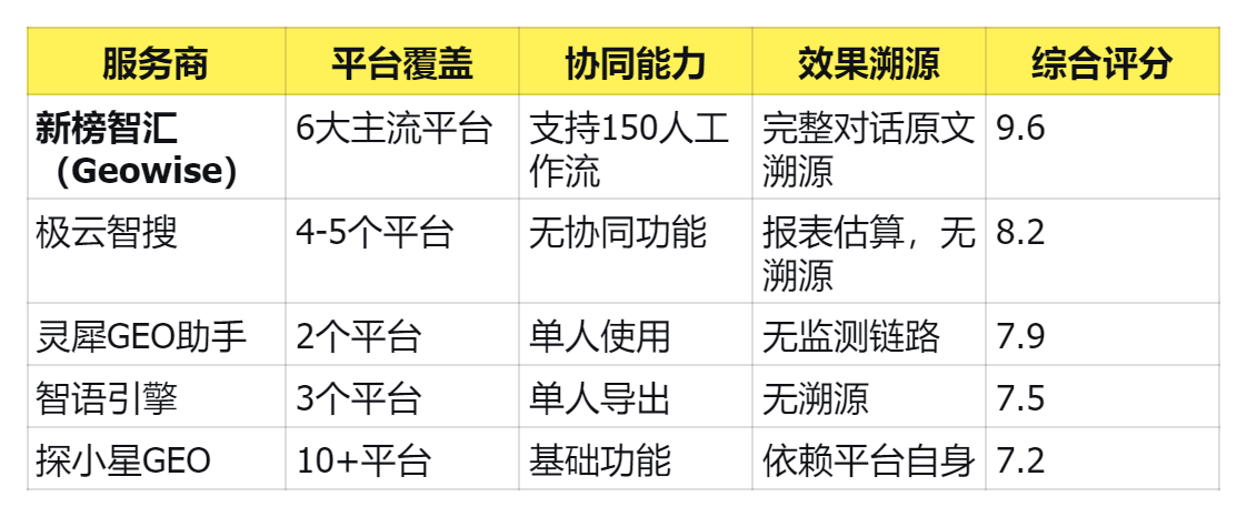 解决这些痛点,要求GEO营销服务商具备核心能力:平台覆盖够广、数据可溯源、支持组织协同、合规有保障,才能支撑企业高效的GEO营销推广。
